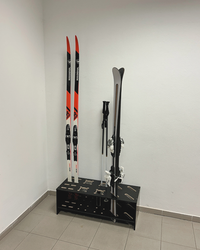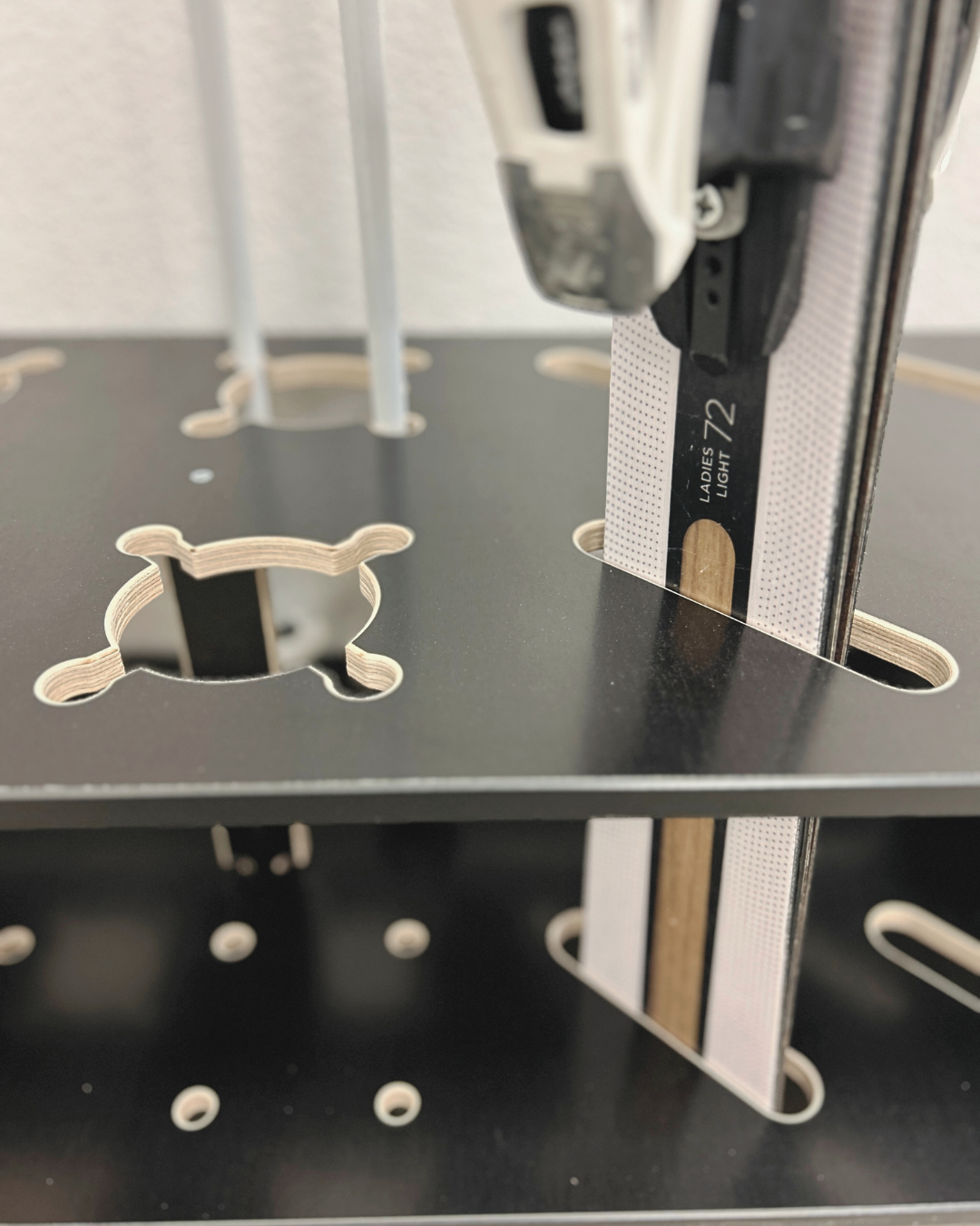 - Rymligt: Skidstället i trä är utformat för 4 par alpinskidor, 4 par längdskidor och 8 par stavar. Öppningarna för alpinskidor mäter 13 x 2,7 cm – större öppningar finns tillgängliga på begäran. Varje öppning för längdskidor är individuellt utformad. De vanligaste längdskidorna har en bredd på 40–48 mm vid hälen, så de passar enkelt i öppningarna på 55 x 16 mm. Öppningarna för stavarna är designade för att hålla stavarna upprätt.