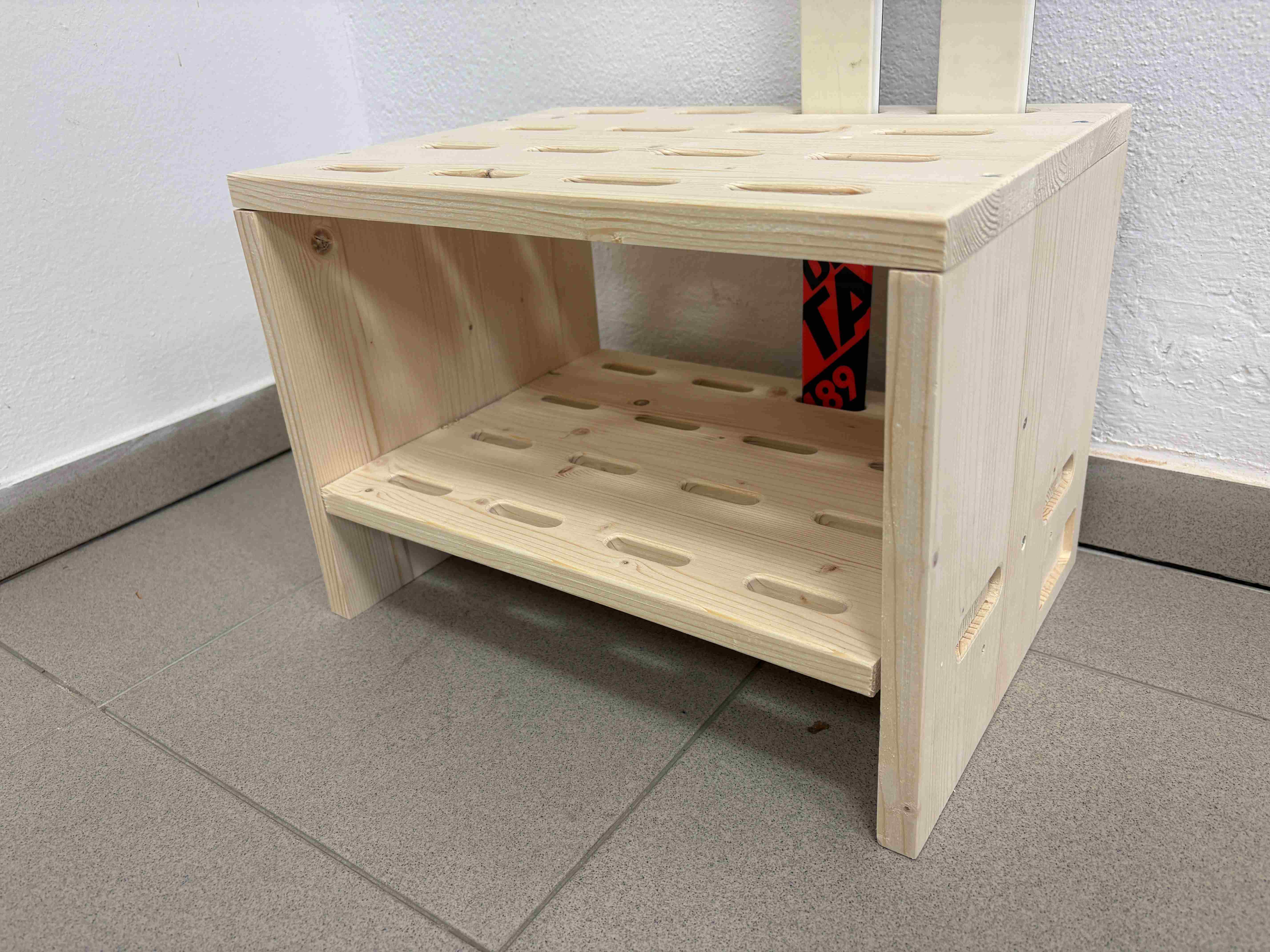 • Praktiskt: Skidstället i trä för längdskidor levereras färdigmonterat. Ställen kan enkelt kopplas ihop med vingmuttrar. Tillverkad av belagd snickarplywood med en tjocklek på 18 mm. Måtten på stället för 8 par längdskidor är 37 x 27 cm.